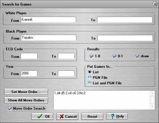 Get a list of games from the MasterChess library of over 1.4 million games by asking for specific player names, ECO codes, years, opening moves and more.